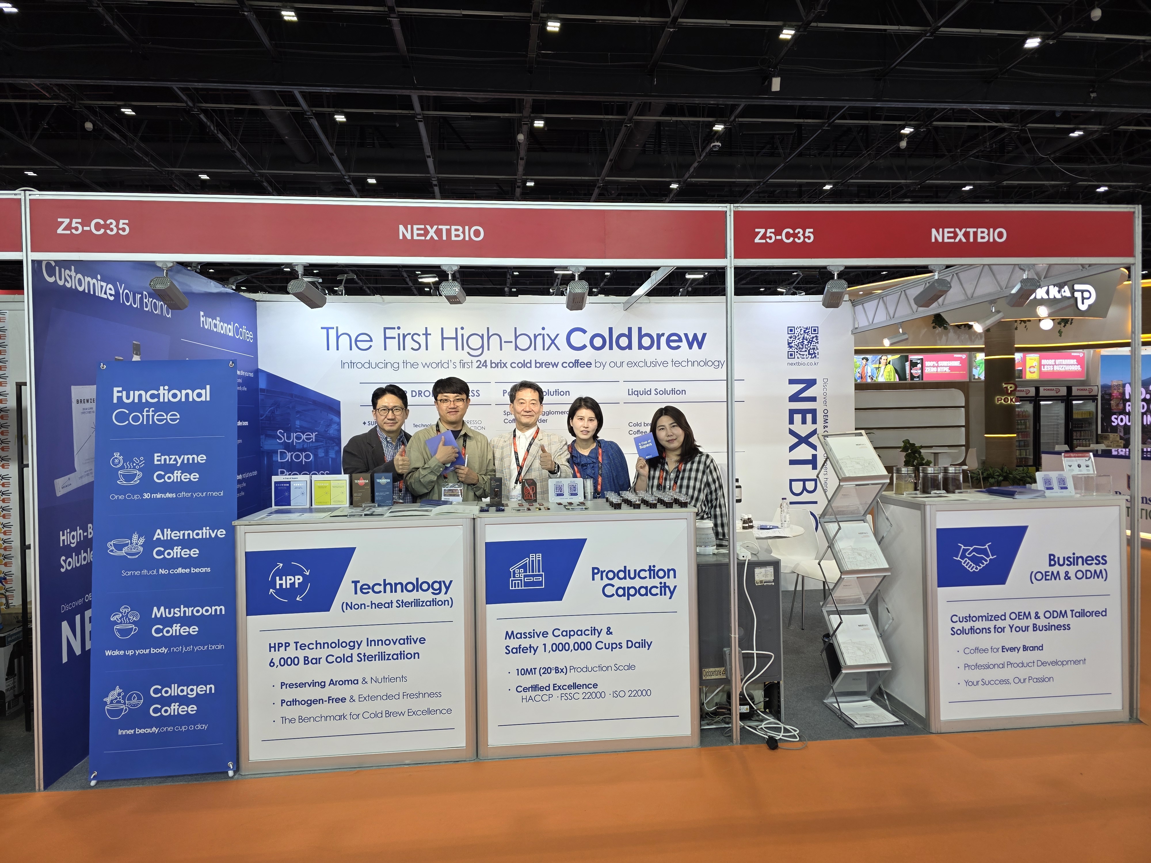 ■ 눈으로 증명한 압도적 기술력 'SUPER DROP' 공정의 우수성을 시각화한 부스 구성으로 글로벌 바이어들의 발길을 사로잡았습니다. 넥스트바이오 유일한 콜드브루 커피 추출 생산 시스템은 현지 관계자들에게 강력한 신뢰를 주기에 충분했습니다.